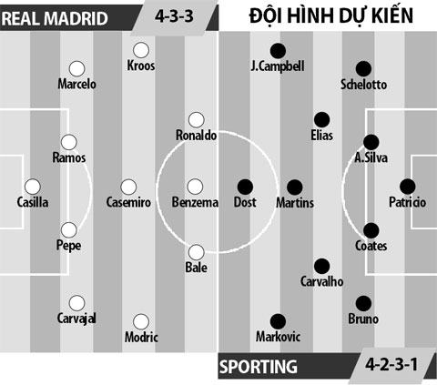 Đêm nay, đội hình Real còn sẽ thi đấu rất sung sức. Ở trận đại thắng Osasuna cách đây ít hôm, HLV Zidane đã cho không ít trụ cột nghỉ ngơi. Cụ thể, cặp hậu vệ cánh uy lực Carvajal và Marcelo được nghỉ ngơi hoàn toàn. Tiền vệ phòng ngự Casemiro cũng không đá phút nào. Trong khi đó, Ronaldo và Modric chỉ ra sân hơn 60 phút. Bale cũng được rút ra ở phút 74. Benzema chỉ vào sân ở nửa cuối hiệp 2. Tất cả đều đã được dưỡng sức chu đáo cho Champions League. Chưa hết, Real còn sẽ tiếp đón Sporting với lực lượng gần như đầy đủ, khi Isco và Coentrao đã bình phục chấn thương. Vắng mặt duy nhất của họ chỉ là thủ thành Keylor Navas.