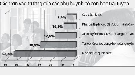 Và để con mình được học tại trường trái tuyến như mong muốn, 54,4% phụ huynh khi được hỏi đã thừa nhận mình có nhờ người quen biết “chạy” trường cho con. Trong khi đó, 30,9% phụ huynh khác cho biết mình “tự nộp hồ sơ vào trường không đúng tuyến”. Đáng lưu ý, cứ mười phụ huynh được hỏi thì có một người tiết lộ mình “phải trả lệ phí cao để được nhận hồ sơ” chạy trường cho con.