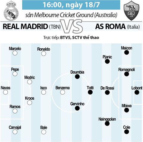 Tất nhiên, tất cả những sự thay đổi về sơ đồ trên sẽ được áp dụng ngay ở cuộc tập trận với Roma. Diện mạo của Real ở mùa tới về cơ bản sẽ được phác họa vào chiều nay. Điều đáng tiếc duy nhất là Real sẽ không có sự phục vụ của James Rodriguez, cầu thủ vẫn đang trong kỳ nghỉ bù vì dự Copa America 2015. Tạm thời vai trò đặc biệt quan trọng của James sẽ do Isco đảm nhiệm. Ngoài ngôi sao người Colombia, Real chỉ thiếu một cầu thủ không quá quan trọng trong danh sách du đấu Australia lần này là hậu vệ dự bị Fabio Coentrao vì chấn thương.