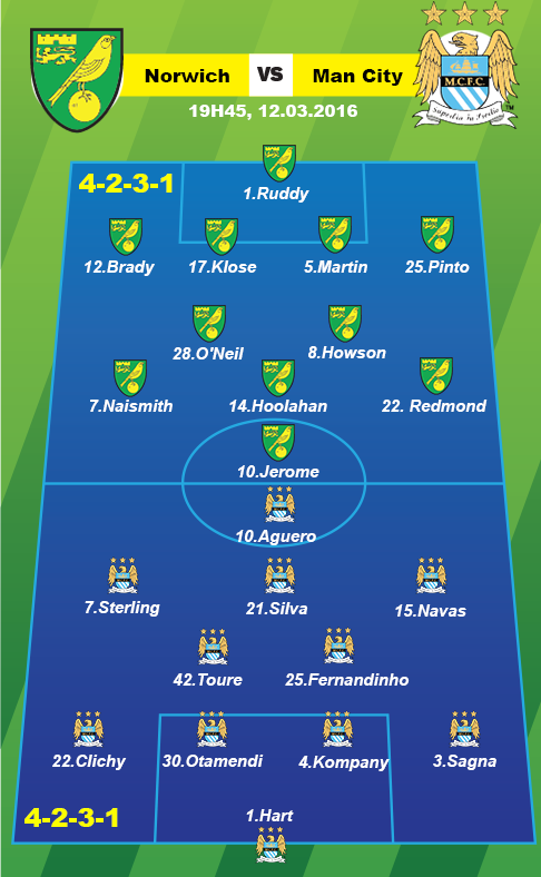 Về mặt lực lượng, HLV Manuel Pellegrini nhiều khả năng sẽ cho tiền vệnhạc trưởng David Silva nghỉ ngơi ở trận gặp Norwich do anh vẫn còn bị đau mắt cá chân. Trong trường hợp Silva vắng mặt, HLV Pellegrini có thể sẽ sử dụng sơ đồ chiến thuật hai tiền đạo. Suất đầu tiên trên hàng công nghiễm nhiên thuộc về chân sút số 1 Sergio Aguero. Như vậy, Wilfried Bony và tài năng trẻ Kelechi Iheanacho sẽ được cân nhắc cho vị trí còn lại. Bộ ba tiền vệ Fabian Delph, Kevin De Bruyne và Samir Nasri vẫn chưa thể trở lại do chấn thương.