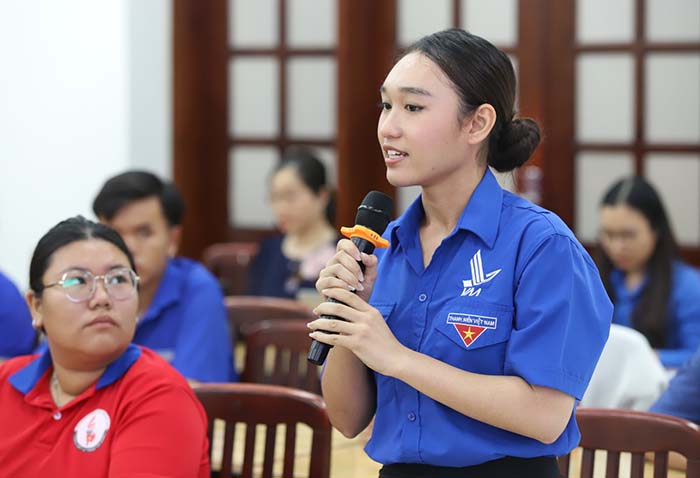 Chị Nhan Ngọc Hảo Tiên (nguyên Chỉ huy trưởng chiến dịch Hoa phượng đỏ Trường THPT Trần Khai Nguyên) trao đổi tại buổi giao lưu