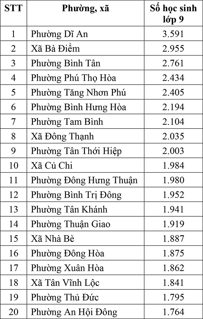 Theo thống kê trên địa bàn 168 phường, xã, đặc khu của TP.HCM, có 20 địa phương có số lượng học sinh lớp 9 năm học 2025-2026 đông nhất, với gần 43.300 em, tỷ lệ 25,6% học sinh lớp 9 toàn thành phố. Trong đó, phường Dĩ An dẫn đầu với 3.591 học sinh lớp 9.