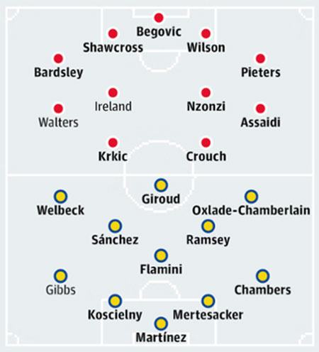 Arsene Wenger có thể cho Oliver Giroud thi đấu ngay từ đầu để đối phó với các cầu thủ to cao bên phía Stoke. Đá bên cạnh Giroud sẽ là Danny Welbeck. Phần còn lại của đội hình không có nhiều xáo trộn. Nacho Monreal tiếp tục được tin tưởng ở vị trí hậu vệ trái, còn trong khung gỗ vẫn là Emiliano Martinez, người bắt thay Wojciech Szczesny đang chấn thương.