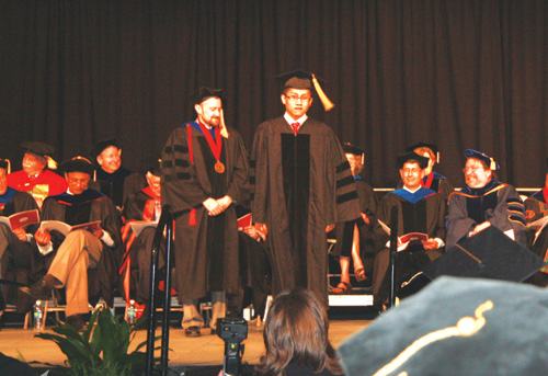 Lâm Duy Việt (đứng, bên phải) tại buổi lễ nhận bằng tiến sĩ ở ĐH Carnegie Mellon