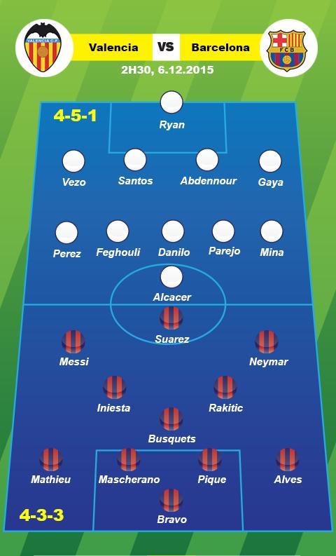 Valencia: Diego Alves, Rodrigo, Negredo, Mustafi, Barragán – Dính chấn thương nặng; Cancelo, Fuego – Vắng mặt vì án treo giò; Gomes, Piatti – Chưa chắc ra sân.