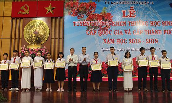 UBND quận 12 (TP.HCM) vừa tổ chức Lễ tuyên dương, khen thưởng cho 341 học sinh giỏi, học sinh đạt thành tích cao trong các kỳ thi, hội thi cấp thành phố và cấp quốc gia năm học 2018-2019. Đây là hoạt động thường niên nhằm kịp thời động viên, khích lệ tinh thần học tập, khuyến khích, nhân rộng phong trào thi đua “Dạy tốt – Học tốt” trong học sinh và giáo viên trên địa bàn quận 12. Được biết trong các kỳ thi cấp quốc gia, cấp thành phố đều có học sinh tham gia và đạt giải, đặc biệt trong kỳ thi Olympic tháng 4 cấp thành phố, học sinh quận 12 đạt 206 huy chương với 41 huy chương vàng, 86 huy chương bạc, 79 huy chương đồng, đứng thứ 3 toàn thành phố (THCS).