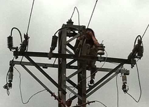 Cô gái ngồi trên trụ điện cao thế. Ảnh: Quốc Dũng.