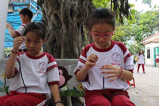 | Khánh Duyên (phải) và bạn say mê với trò chơi xâu vòng |