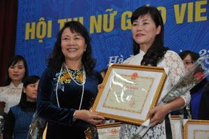 Thứ trưởng Bộ GD-ĐT Nguyễn Thị Nghĩa trao bằng khen cho giáo viên đạt giải cao. Ảnh: Kim Khang |