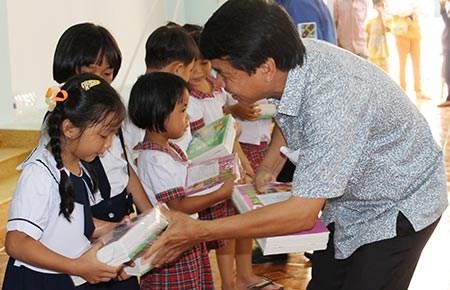 Đại diện ngân hàng trao sách cho các em. Ảnh: HOÀNG LAN