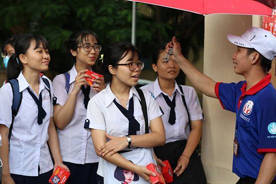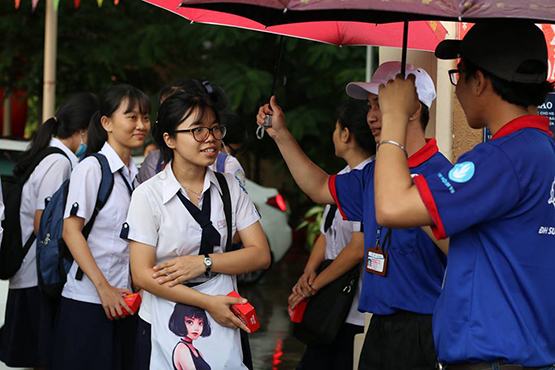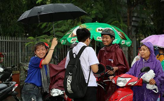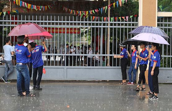Cơn mưa nặng hạt đổ xuống bất ngờ không chỉ khiến hàng trăm phụ huynh ở bên ngoài tầm tã, ướt nhẹp, mà bên trong điểm thi, dù thời gian thi đã kết thúc khá lâu nhưng thí sinh vẫn bị “chôn chân”, chưa thể ra ngoài. Tại điểm thi, để hỗ trợ tối đa cho thí sinh, đội tình nguyện tiếp sức mùa thi của trường Đại học Sư phạm Kỹ thuật TP.HCM với hơn 20 thành viên đã “đội mưa” che dù cho thí sinh cùng phụ huynh rời khỏi điểm thi.