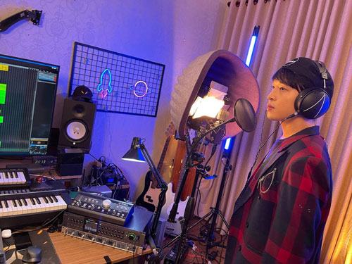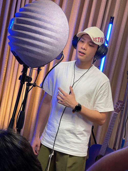 Ca sĩ Ưng Hoàng Phúc và các nghệ sĩ khẩn trương thu âm để tung ra ca khúc cổ vũ tinh thần tuyến đầu chống dịch và lan tỏa thông điệp tích cực đến cộng đồng. Ảnh: NVCC