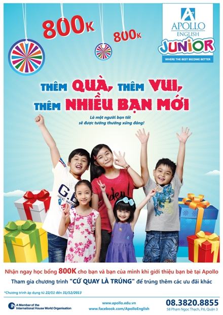 Apollo English chính thức triển khai chương trình ưu đãi cuối cùng trong năm 2013 dành cho học viên mang tên “Thêm quà, thêm vui, thêm nhiều bạn mới”. Với chương trình này, các học viên của Apollo English khi giới thiệu bạn bè tham gia đăng ký khóa học mới sẽ được tặng học bổng 800,000 đồng và quay trúng thưởng thêm các món quà hấp dẫn khác thông qua trò chơi “Cứ quay là trúng”.