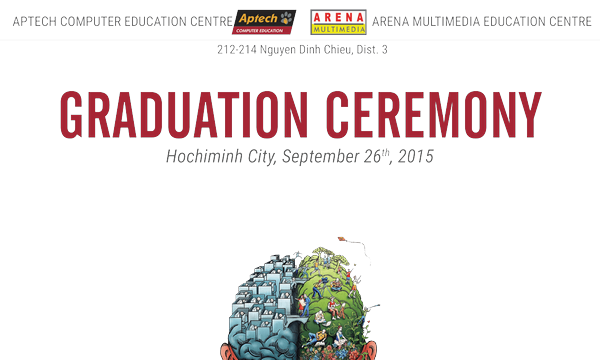 Sáng ngày 26/09/2015, Trường Đào tạo Mỹ thuật Đa phương tiện Arena Multimedia và Hệ thống Đào tạo Lập trình viên Quốc tế Aptech đã tổ chức Lễ trao bằng tốt nghiệp với chủ đề "Não trái – Não phải" cho sinh viên khóa 2012 – 2015 tại Trung tâm Hội nghị 272 (Quận 3, TP HCM).