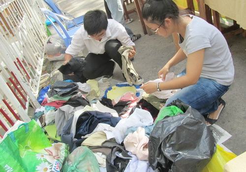 Các tình nguyện viên phân loại quần áo để chuẩn bị cho hoạt động trao đổi đồ cũ – Ảnh: Trung Uyên