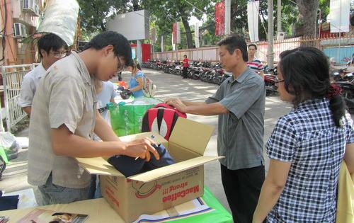 Những người dân đầu tiên (bìa phải) mang quần áo cũ đến trao đổi tại lễ phát động chiến dịch "Tiêu dùng sản phẩm xanh" – Ảnh: Trung Uyên