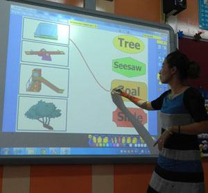 Cô Nguyễn Hoàng Diễm Trang – Tổ trưởng Tổ tiếng Anh, Trường Tiểu học Nguyễn Văn Trỗi, Q.4 kể lại: “Trước đây chưa có bảng tương tác, mỗi khi giảng bài, ngoài cuốn sách giáo khoa, “đồ nghề” của giáo viên còn có thêm một bộ tranh khổ A4 ép plastic, ti vi, một bộ thẻ từ (từ ngữ – PV)… Nếu học về con vật, giáo viên giơ hình con vật và thẻ từ tương xứng với tên con vật đó lên cho học sinh nhìn. Sau đó, bật ti vi để học sinh nhìn thấy con vật di chuyển. Song, nay có bảng tương tác, giáo viên không chỉ đưa hình ảnh con vật sống động lên màn hình để học sinh theo dõi mà còn có cả âm thanh nữa. Giáo viên không cần phải cầm thẻ từ giơ lên nữa. Học về các chữ, trên bảng tương tác có một dãy chữ, kế bên là một dãy hình. Học sinh lấy tay rê chữ vào hình sao cho khớp. Học sinh làm đúng sẽ được nghe lời khen ngợi, tiếng vỗ tay (do giáo viên chèn vào – PV)…”.