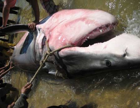 Con cá dữ dài 5m, vòng thân 3,5m, ước chừng nặng hơn một tấn, miệng lởm chởm răng nhọn hoắt. Theo ngư dân này, đây là con cá mập lớn nhất ông từng bắt được.
