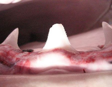 | Bộ răng lởm chởm của con cá mập bị bắt. Ảnh: Minh Thảo |