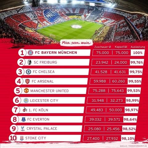 Mỗi khi thi đấu trên sân nhà Allianz Arena, Bayern luôn có đủ 100% khán giả, qua đó giúp Hùm xám dẫn đầu châu Âu về tỷ lệ phủ sân.