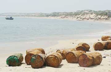 Các thùng phuy phát hiện tại khu vực bờ biển Liên Hương.