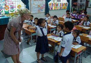 Tuy nhiên, Sở GD-ĐT khuyến khích các trường có thể mời giáo viên bản ngữ từ các trung tâm ILA, Apollo và Language Link… đến giảng dạy. Ngoài ra, sở cũng khuyến khích các trường tham gia các chương trình hỗ trợ về phương tiện giảng dạy của Công ty Phonics Learning Box – UK hoặc Công ty DynEd. Cô Nguyễn Thị Lan Hương, Hiệu trưởng Trường Tiểu học Cổ Loa (Phú Nhuận) cho biết: “Với sự giúp đỡ của Phonics, DynEd đã góp phần giảm đi nhiều khó khăn trước mắt về CSVC cũng như kinh phí thi cử cho các trường. Chúng ta nên nhìn vào thành quả mà vượt qua khó khăn”. Cụ thể, Trường Tiểu học Nguyễn Bỉnh Khiêm (Q.1) là trường đầu tiên ở TP.HCM đã vận dụng sự hỗ trợ phần mềm giảng dạy của DynEd. Cô Ngô Thị Ngọc Thúy, giáo viên trường này đã nói: “Phần mềm giảng dạy DynEd hỗ trợ HS nghe, nói, đọc, viết một cách tối đa; học ngữ pháp kết hợp với nghe trên máy tính; HS được so sánh giọng đọc của mình với giọng đọc bản ngữ; được tương tác với máy tính bằng tiếng Anh; có phần mềm quản lý thành tích học tập thông minh, tự nhận dạng giọng nói… Đây là chương trình hoàn thiện các kỹ năng, gắn kết lớp học, tạo nên buổi học rất hiệu quả”.