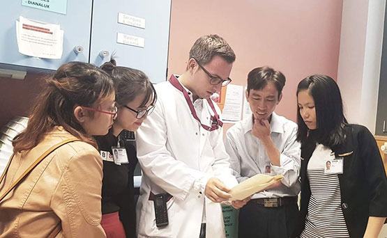 BS Nguyễn Triệu Vũ (thứ 2 bên phải) trao đổi với đồng nghiệp về phương pháp mới điều trị ung thư