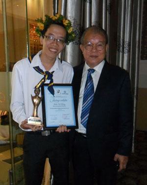 Hứa Vũ Bằng (trái) cùng GS. Võ Tòng Xuân tại lễ trao giải thưởng tài năng Lương Văn Can 2013