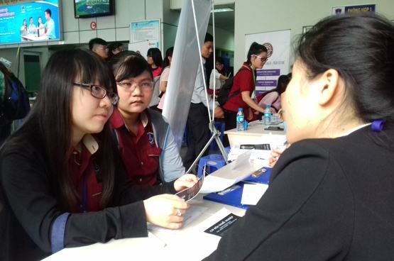 | Sinh viên tìm hiểu thông tin việc làm tại một ngày hội tuyển dụng. Ảnh: M.Tâm |