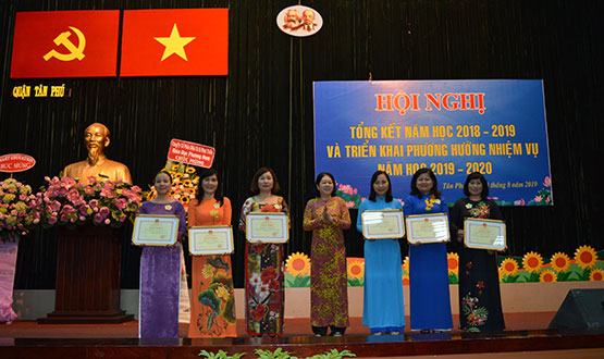 Phó Giám đốc Sở GD-ĐT TP Bùi Thị Diễm Thu (thứ 4 từ trái sang) trao Bằng khen cho các tập thể xuất sắc của ngành GD Q.Tân Phú