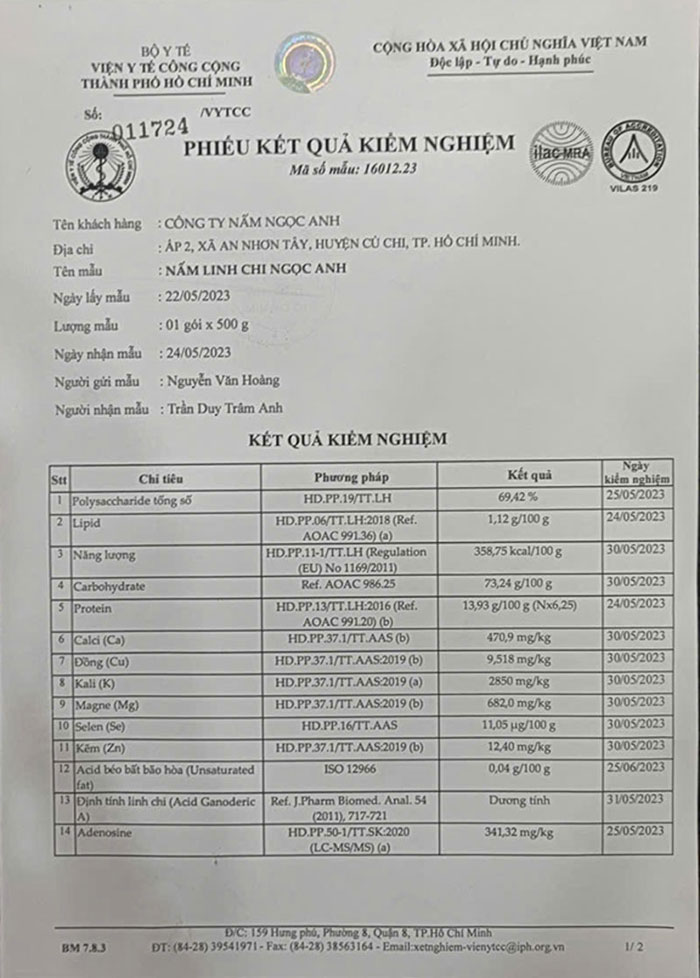 Theo dữ liệu tại Viện Y tế Công cộng TP.HCM, linh chi trồng trong điều kiện ổn định thường đạt 10–15% polysaccharides. Một số mẫu nuôi trên giá thể giàu lignin – cellulose hoặc gỗ tự nhiên đặc chủng có thể đạt 40–70%. Kết quả phân tích từ cơ sở tại Củ Chi ghi nhận mức ≥ 69,42%, nằm trong khoảng giá trị cao thường gặp ở các mẫu linh chi chất lượng.