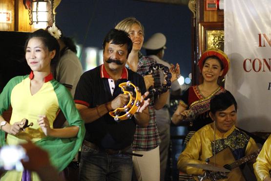 | Du khách nước ngoài thưởng thức âm nhạc dân tộc Việt Nam trên du thuyền |