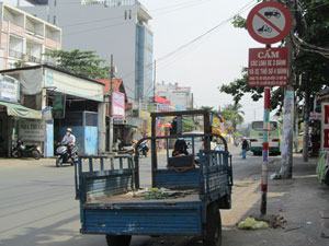 Tại địa chỉ số 46 Ung Văn Khiêm, phường 25, Bình Thạnh, TP.HCM là nơi có bảng “Cấm các loại xe 3 bánh và xe thô sơ 4 bánh từ 5 giờ đến 13 giờ, từ 16 giờ đến 22 giờ”, nhưng thực tế giờ nào cũng có các loại xe bị cấm này hoạt động do đây là khu vực bán nhiều vật liệu xây dựng. Thậm chí có xe ba gác còn ngang nhiên đậu chờ khách ngay ở chân bảng cấm (Hình 2).