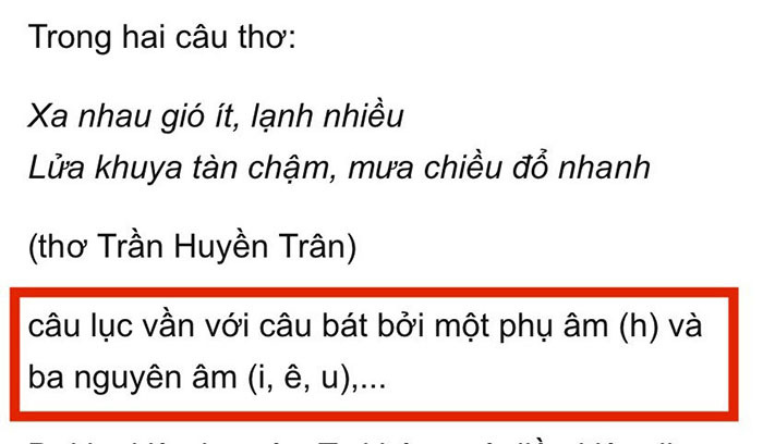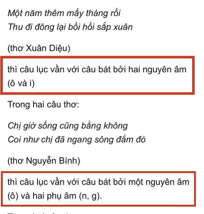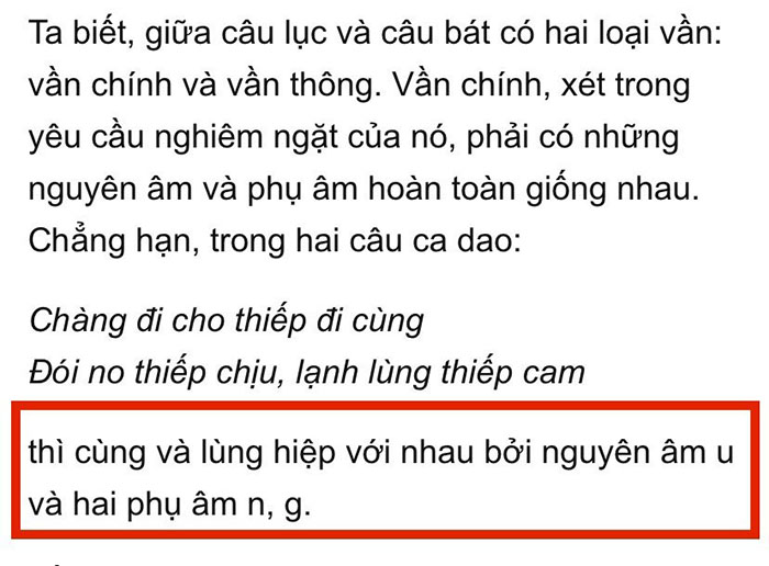 “… câu lục vần với câu bát bởi hai nguyên âm (ô và i)” (sic), cần sửa lại cho chuẩn “câu lục vần với câu bát bởi chung vần ôi”; còn “… câu lục vần với câu bát bởi một nguyên âm (ô) và hai phụ âm (n, g)” (sic) cũng cần viết cho đúng là “câu lục vần với câu bát bởi cùng vần ông”.