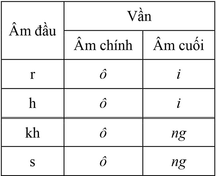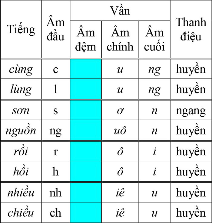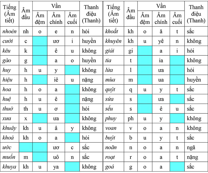 Căn cứ vào lý thuyết trên, thử khảo sát một bài tập trong chương trình tiểu học, chúng ta có bảng phân tích âm tiết sau: