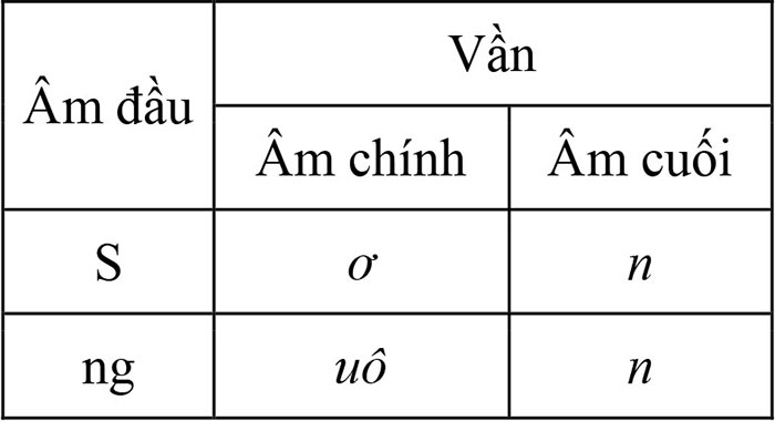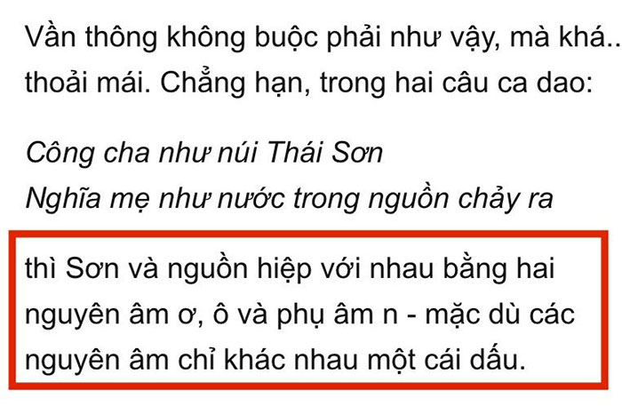 Không phải “Sơn và nguồn hiệp với nhau bằng hai nguyên âm ơ, ô và phụ âm n – mặc dù các nguyên âm chỉ khác nhau một cái dấu” (sic), mà đúng ra là “Sơn và nguồn hiệp với nhau bởi vần ơn với vần uôn” theo bảng sau: