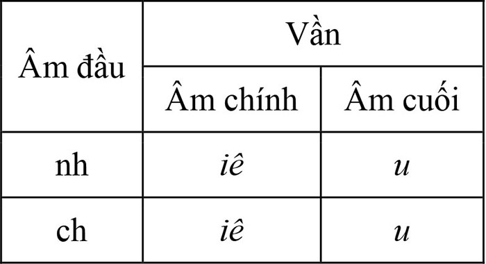 Đáng tiếc nhất, trong dẫn liệu trên, tác giả đã nhầm lẫn nghiêm trọng khi nhập “h” vào phần vần: “… câu lục vần với câu bát bởi một phụ âm (h) và ba nguyên âm (i, ê, u)” (sic). Bởi “h” là thành tố của âm đầu “nh”, không tham gia vào việc tạo vần, còn phần vần “iêu” của cả 2 tiếng trên thì trùng nhau hoàn toàn, bao gồm nguyên âm đôi “iê” và bán âm cuối “u”, nên nói “ba nguyên âm (i, ê, u)” là không thỏa đáng, thậm chí bị sai lệch trầm trọng. Cần lưu ý quy tắc: “nguyên âm không bao giờ làm âm cuối” mà chỉ có 8 phụ âm và 2 bán nguyên âm (như đã dẫn trên) đảm đương nhiệm vụ này mà thôi, nên trong cả hai tiếng nhiều – chiều, âm cuối không phải là nguyên âm /u/, mà là bán âm đệm /-u̯/, do đó phải sửa lại cho chuẩn: “câu lục vần với câu bát bởi cùng vần iêu”, như bảng sau: