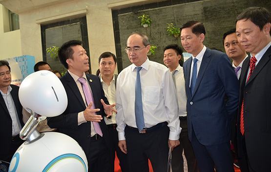 Bí thư Thành ủy TP Nguyễn Thiện Nhân tham quan gian hàng của các DN có sản phẩm công nghệ nổi bật vừa đạt giải thưởng. Ảnh: N.Tr