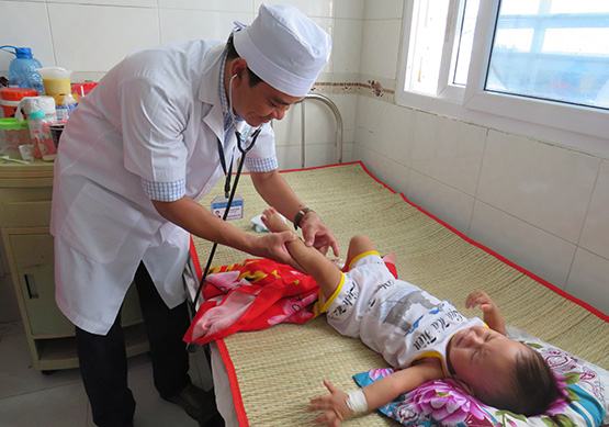 BS Nguyn Hunh Nht Trưng đang thăm khám cho mt bnh nhi mc st xut huyết.  Ảnh: Đ.Thơ