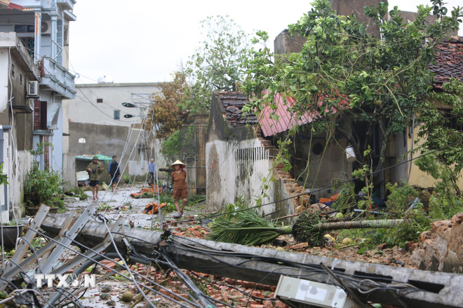 Các lực lượng, chính quyền xã giúp người dân dọn dẹp nhà bị sập, tốc mái ở xã Hoằng Giang. Ảnh: Việt Hoàng/TTXVN