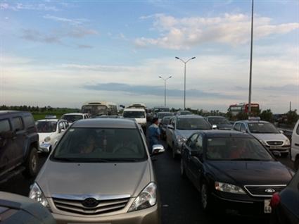Dù đã huy động 4 trạm thu phí cùng một lượng khá đông nhân viên phân luồng nhưng từ khoảng 4h đến 6h chiều ngày 8/7, đoạn nút giao Đại Xuyên bị tắc cứng tới hàng km. Hàng trăm xe nhích từng mét để được đến lượt trả tiền phí.