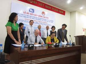Đại diện Công ty Dầu khí TNK Vietnam và bà Lê Minh Ngọc – Giám đốc Quỹ Khuyến học TP.HCM – ký kết hợp đồng tài trợ học bổng |