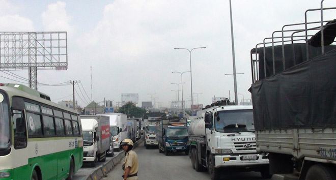 Do vụ việc xảy ra vào giờ cao điểm khiến hàng ngàn xe cộ kẹt cứng. Các xe tải lớn, xe container nhích từng mét để qua cầu. Trời nắng nóng, kẹt xe kéo dài gần 2km đã khiến rất nhiều người khó chịu.