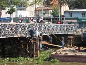 Công nhân khắc phục sự cố cầu tạm cầu Bông vào chiều 5-3 |