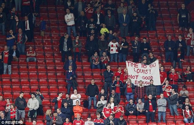 CĐV Man Utd la ó, giăng biểu ngữ đòi HLV Van Gaal ra đi ngay trong quá trình vị chiến lược gia người Hà Lan phát biểu tri ân CĐV.