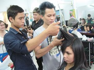Còn Bùi Duy Hội (huyện Gia Bình, Bắc Ninh) đang theo lớp chuyên sâu nghề tóc tại trường chia sẻ: “Em tốt nghiệp THPT cách đây mấy năm nhưng do điều kiện kinh tế gia đình không cho phép nên em gác lại giấc mơ đại học. Thay vào đó, em đến TP.HCM kiếm việc làm và dành dụm tiền rồi theo học sơ cấp về làm tóc, vừa tiết kiệm được chi phí vừa có nghề nhanh”. Chàng học viên này kể, lần đầu tiên chạm vào mái tóc khách, em thiếu tự tin và bối rối tới mức không biết phải cắt sao cho phù hợp. Và dĩ nhiên lần đó và cả nhiều lần sau nữa, em liên tục nhận được sự… phàn nàn từ khách hàng. Tuy buồn nhưng đó lại là động lực giúp Hội suy nghĩ, tìm tòi ra khiếm khuyết, học hỏi thầy cô cách khắc phục. Đến nay, sau khóa học căn bản, Hội đã tự tin nắm bắt tâm lý, tư vấn kiểu tóc cho khách và khá thạo các thao tác cắt, gội, uốn, nhuộm… Với Hội, chỉ cần khách hài lòng, khen một câu thôi đã khiến em vui đến… mất ngủ! Tường Vy cũng vậy, em kể: “Có lần em cắt mà quên chừa đuôi tóc theo yêu cầu của khách khiến họ không vừa lòng, tuy chưa bị… bắt đền nhưng em vẫn thấy áy náy. Dù sao cũng từ những lần sai như vậy mà bản thân em mới rút ra được kinh nghiệm. Giờ, trước khi bắt đầu với một khách hàng, bao giờ em cũng để ý, hỏi thật kỹ ý muốn của họ”.