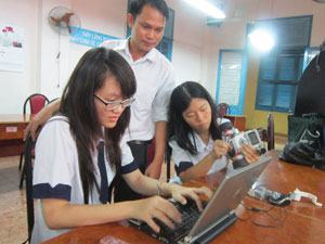 Vũ MinhTú Anh (bên trái) và Ngô Bội Hoàng đang được thầy Bùi Hữu Phi hướng dẫn viết chương trình phần mềm