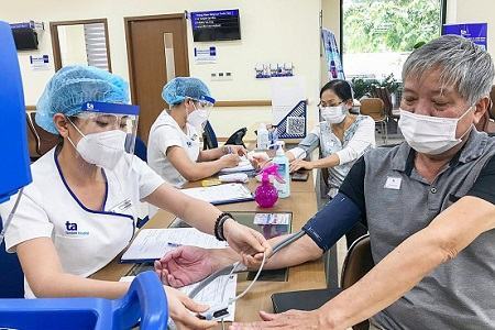 Điều dưỡng BVĐK Tâm Anh đo huyết áp, thăm khám để tiêm ngừa an toàn nhất cho người lớn tuổi