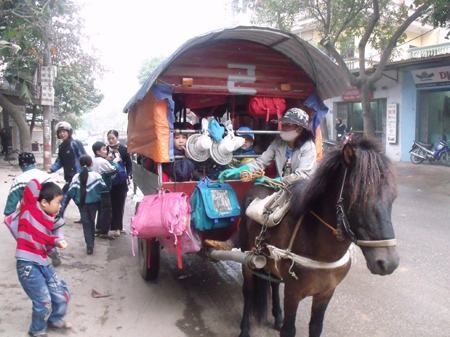 Gần 3 năm trở lại đây, trên con đường 4km từ thôn Dược Thượng (Tiên Dược, huyện Sóc Sơn, Hà Nội) đến Trường tiểu học Duy Tiên chỉ độ 4km, có hai chiếc xe ngựa cứ đều đặn ngày bốn lần chở học sinh đến trường.