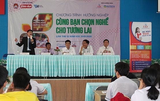 TS. Nhan Cẩm Trí (Phó Hiệu trưởng Trường ĐH Kinh tế – Tài chính TP.HCM) đang tư vấn cho học sinh